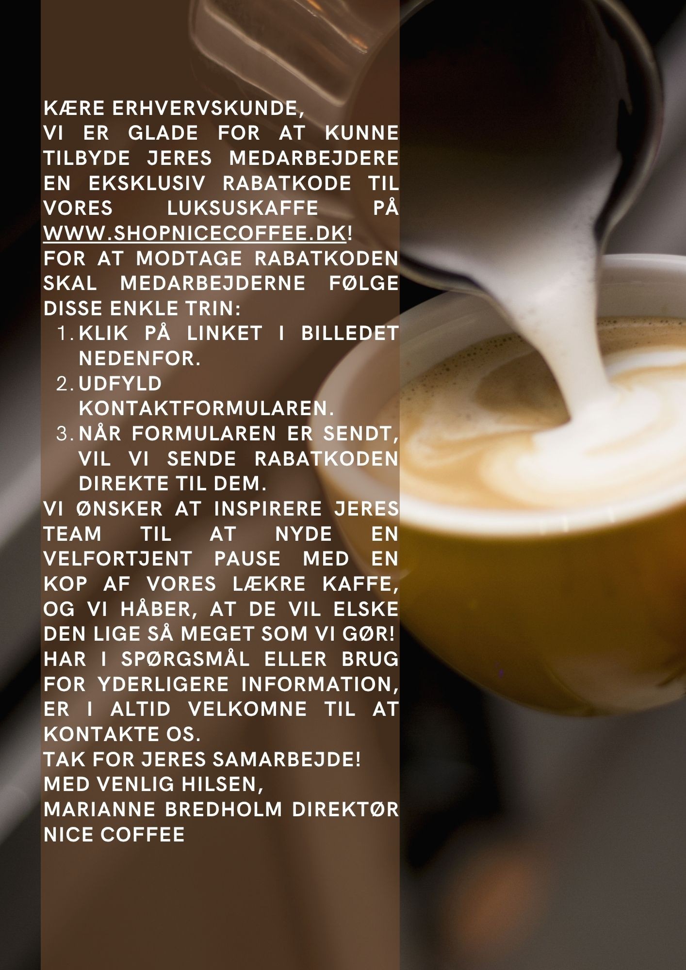 Vi ser frem til at dele vores passion for kaffe med dig/jer og håber, at I vil finde glæde i vores produkter. Tøv ikke med at kontakte os, hvis I har spørgsmål eller ønsker at høre mere om, hvordan vi kan hjælpe jer.