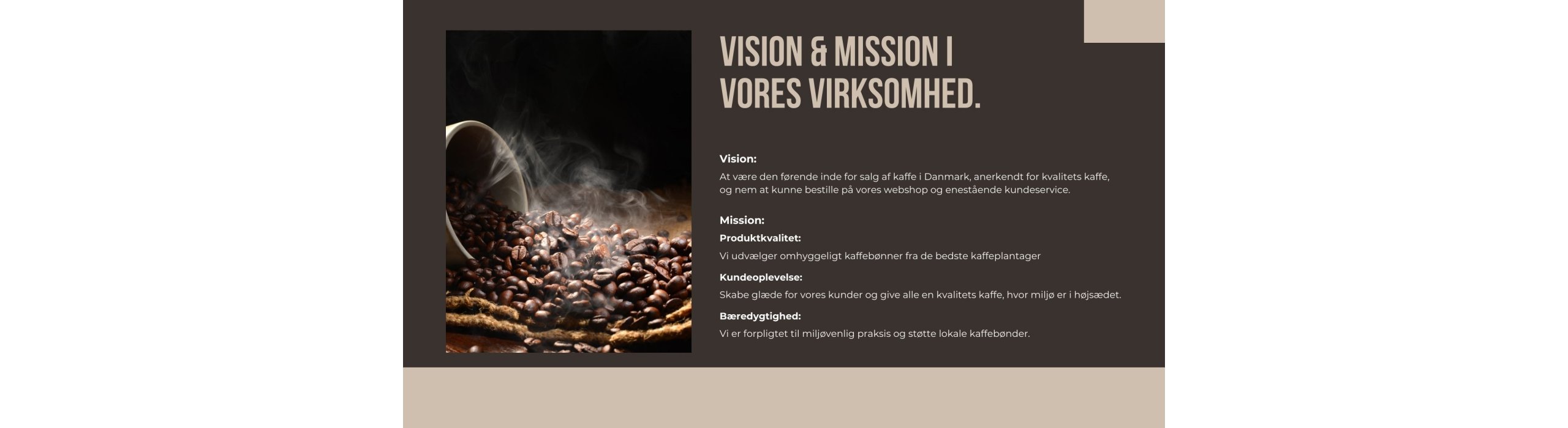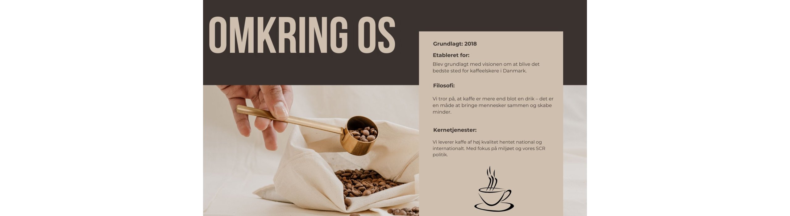 Nice Coffee Aps er en dansk familie ejet virksomhed, der blev startet i 2018, som et enkeltmandsvirksomhed og blev ændret i slut 2023 som et Aps, med det formål at levere en personlig kaffe, men også te løsning til mindre og større virksomheder. Nice Coffee Aps ønsker, at kunne give vores kunder en eksklusiv kaffe eller The oplevelse, hvor alle sanser kommer i spil og får ekstraordiner nydelsen ved en god kop kaffe eller te.